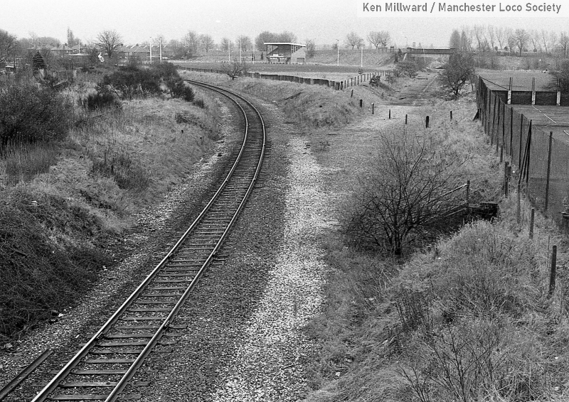 km011-01: 08.03.80 Chorlton Junction. The Fallowfield Loop line is still intact but the Midland route to Cheadle Heath has been lifted. Now the site of St Werburghs Metrolink stop. [HP5/4]