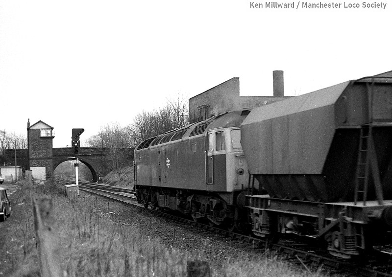 km011-03: 08.03.80 Northenden Junction. 47 199 approaching the junction with a fly ash train. [HP5/4]
