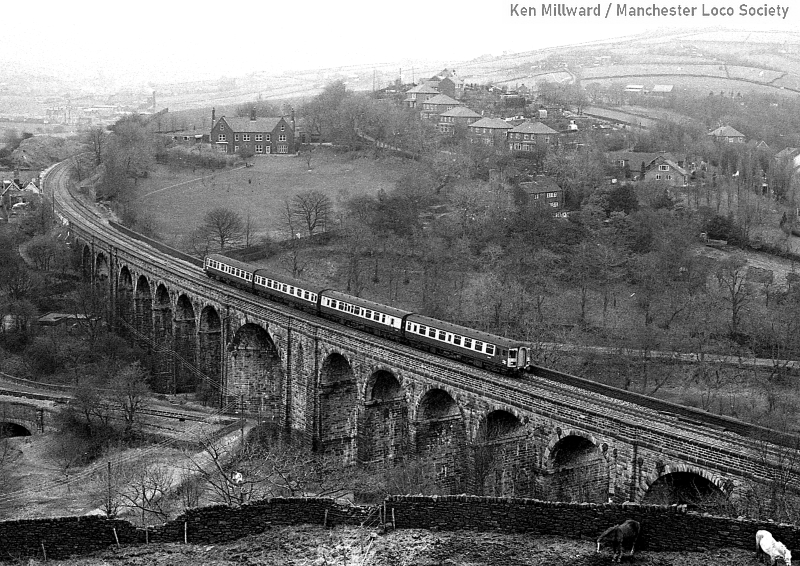 km011-04: 31.03.80 Saddleworth Viaduct. Class 123 Trans-Pennine DMU crossing the viaduct heading west. [HP5/4]