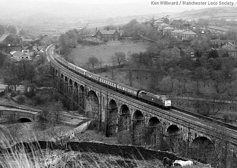km011-05: 31.03.80 Saddleworth Viaduct. 47 405 heads over the viaduct with an express for Liverpool. [HP5/4]