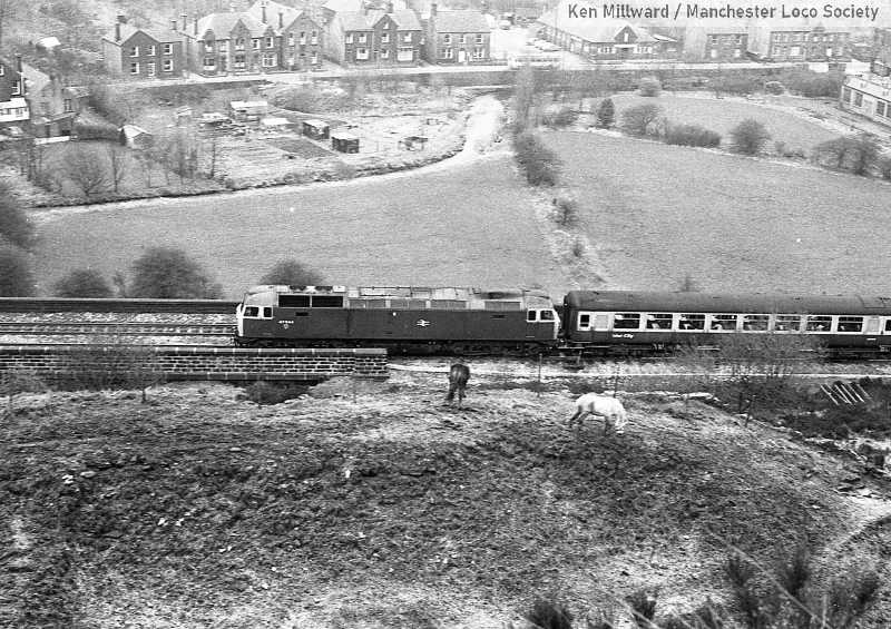 km011-06: 31.03.80 Saddleworth Viaduct. 47 544 with an eastbound passenger train. Uppermill in the background. [HP5/4]
