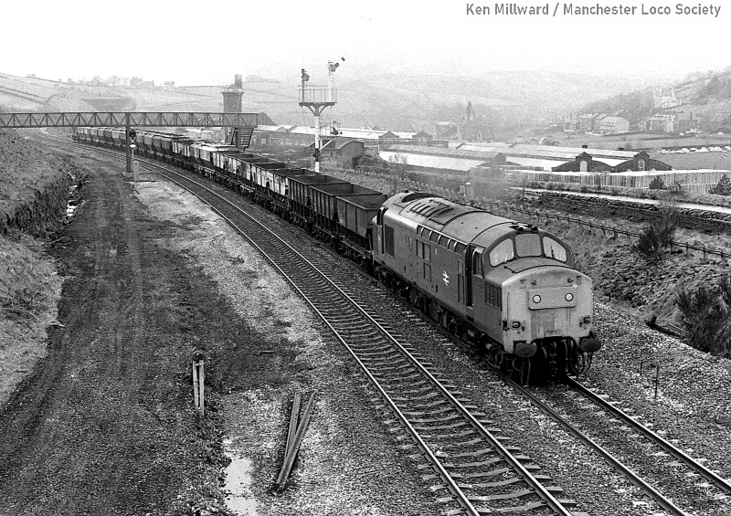 km011-07: 31.03.80 Diggle. 37 141 approaching with an eastbound mixed freight. [HP5/4]