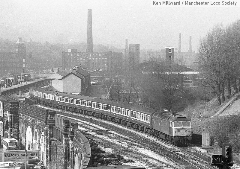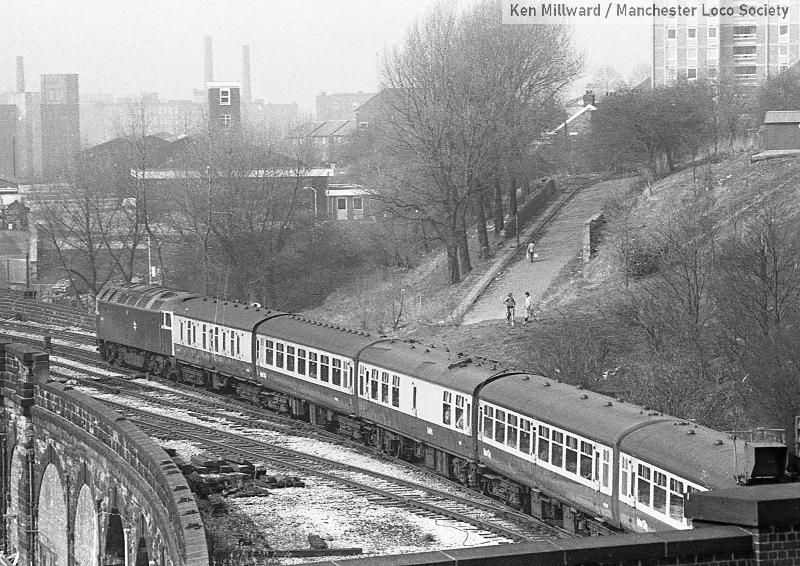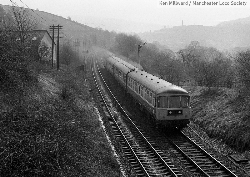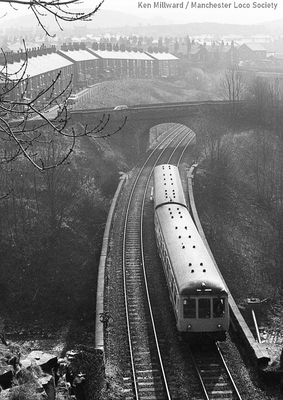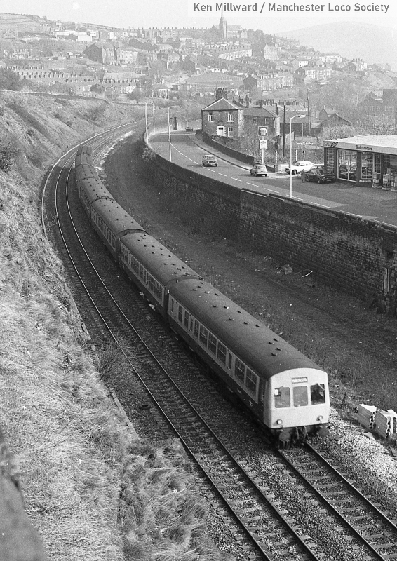 km011-08: 05.04.80 Mossley. 7 car DMU with a Class 101 leading approaching the station with a service to Manchester. [HP5/5]