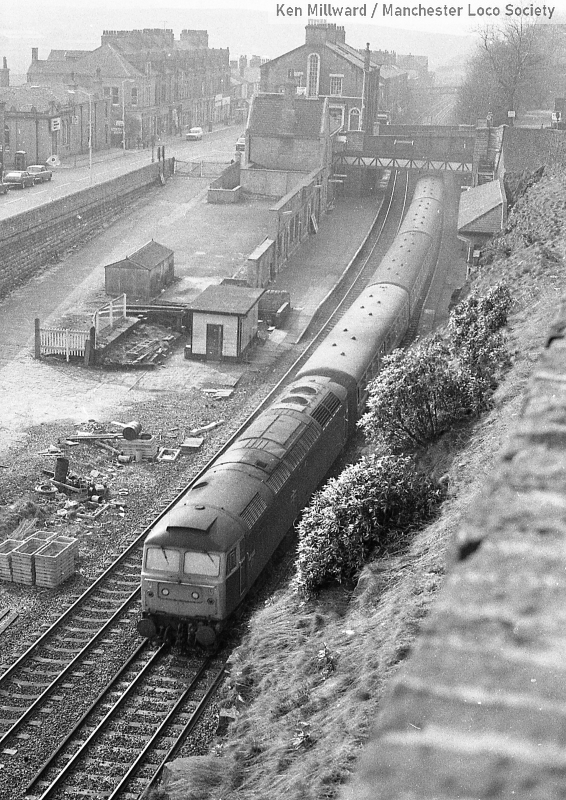 km011-12: 05.04.80 Stalybridge. Unidentified Class 47 approaching the station travelling west. [HP5/5]