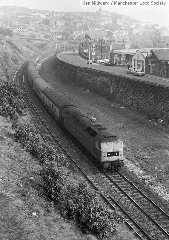 km011-15: 12.04.80 New Mills. Class 124 at Hague Bar with a Manchester bound Trans-Pennine express. [HP5/5]