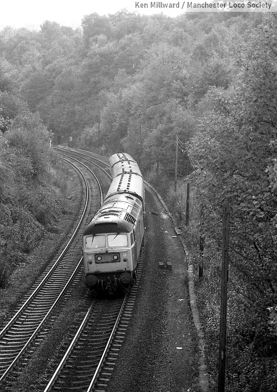 km019-12: 05.12.81 Marsden. 47 518 approaching Marsden Station with an east bound express. [FP4/27]