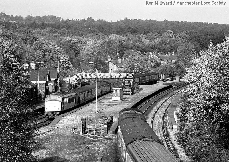 km019-14: 01.12.81 Romiley Junction. DMU leaving Romiley Station with a New Mills Central to Manchester Piccadilly local. [FP4/27]