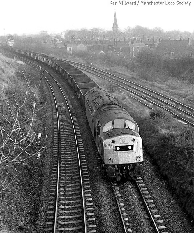 km019-08: 01.12.81 Romiley Junction. 40 185 taking the Guide Bridge line with a lengthy train of scrap wagons. [FP4/27]