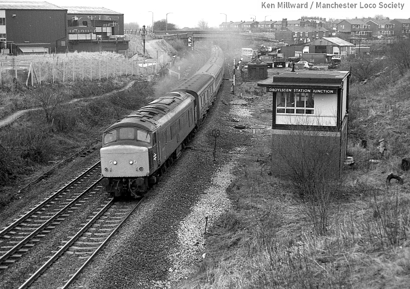 km019-22: 23.01.82 Droylsden Station Junction. 46 009 heading west with an express past the box. [FP4/28]