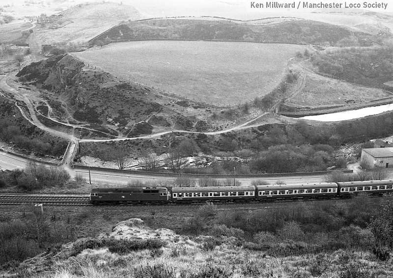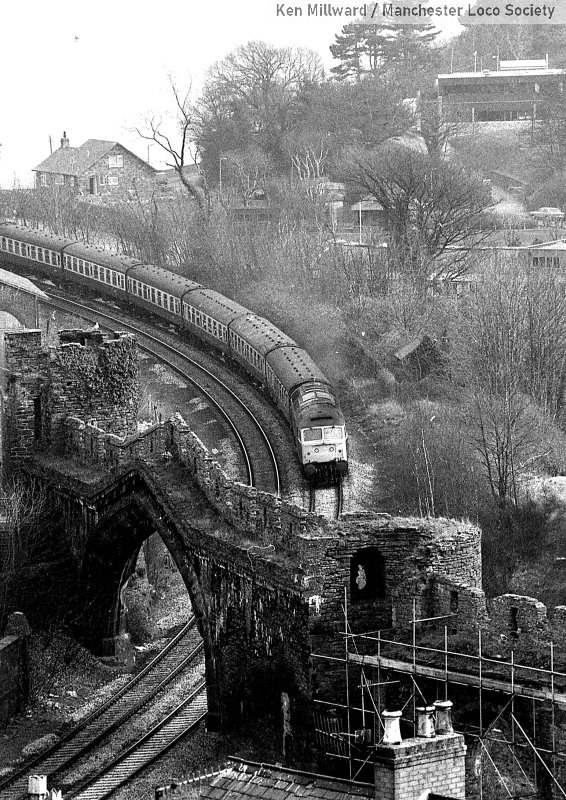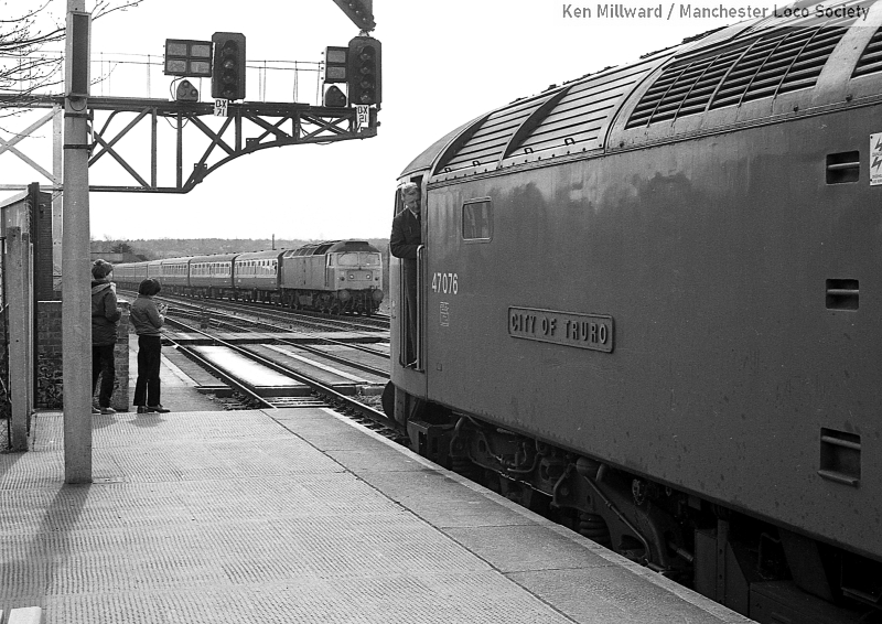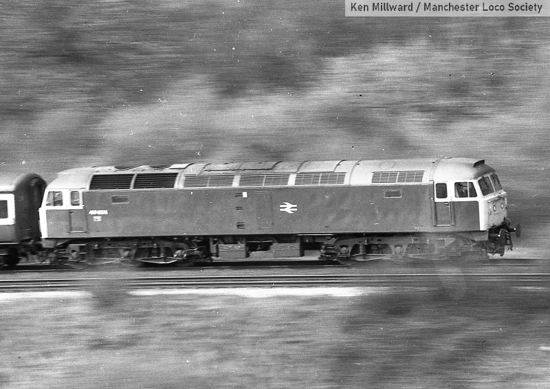 km020-08: 03.04.82 Near Mossley. 47 454 travelling east. (Panned shot). [FP4/30]