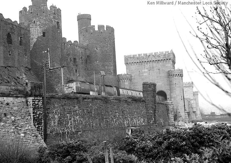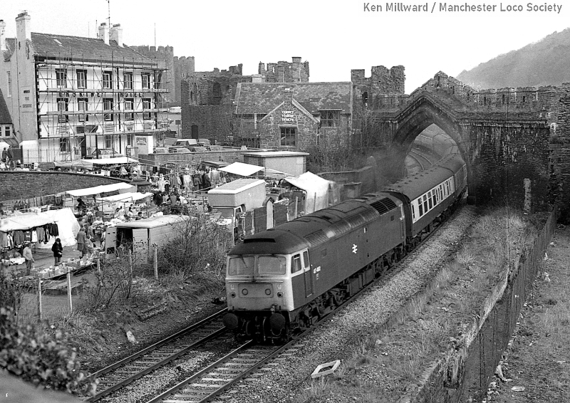 km020-03: 27.03.82 Conwy. 47 490 skirts round the castle on its way to Holyhead from London Euston. [FP4/30]