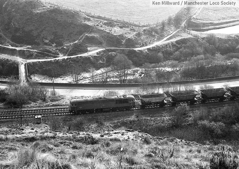 km020-05: 03.04.82 Near Mossley. 56 029 eastbound with an empty MGR train. [FP4/30]