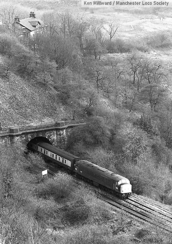 km020-07: 03.04.82 Near Mossley. 45 140 is leaving Mossley Tunnel with a westbound express. [FP4/30]