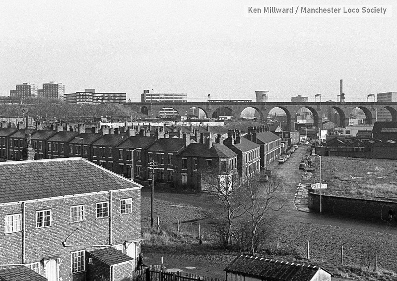 km004-01: 10.02.79 Stockport Viaduct. From above Brinksway Rd. DMU for Stalybridge crossing. Travis St heading from camera. [misc-1]