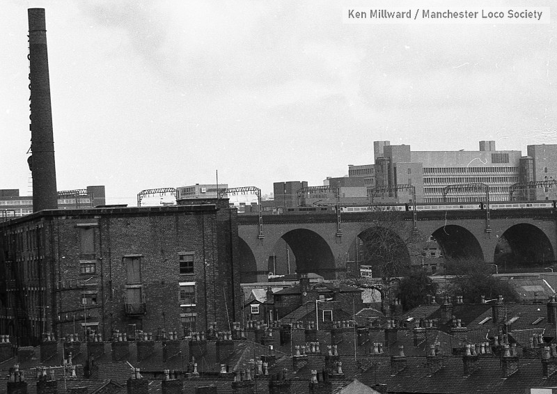 km004-05: 05.05.79 Stockport Viaduct. Wear Mills to the left, Class 86 heading to Manchester. Town Hall in the background. [FP4/5]