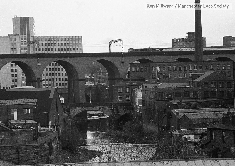 km004-06: 05.05.79 Stockport Viaduct. Class 86 crossing. King Street West bridge and Wear Mill in foreground. [FP4/5]