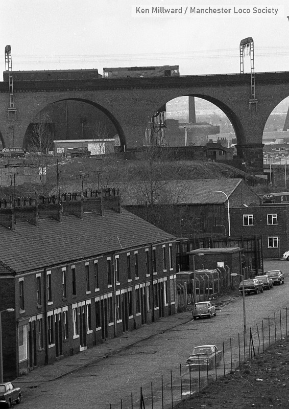 km004-08: 05.05.79 Stockport Viaduct. Class 25 on up parcels. Travis Street in the foreground. [FP4/5]