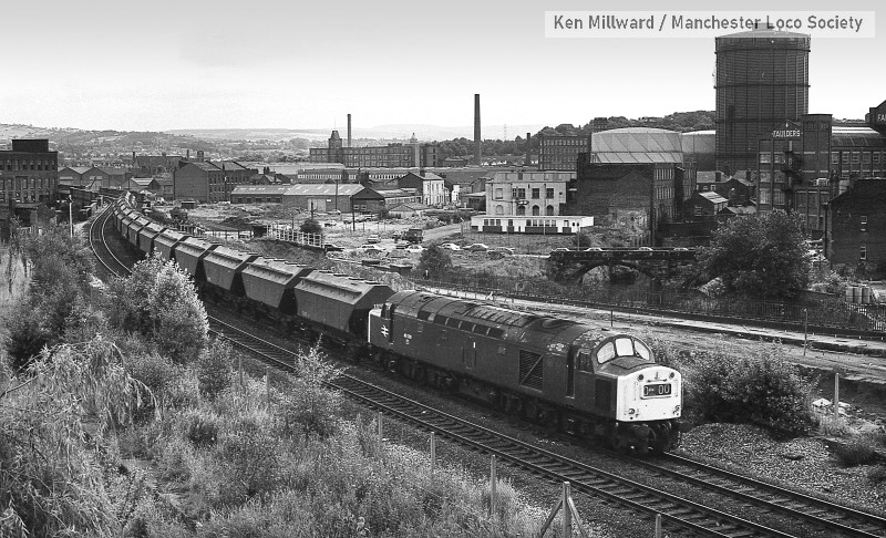 km004-14: 04.08.79 Site of Tiviot Dale Station. 40 170 with the weekly Immingham to Holyhead Aluminium petroleum coke working. [FP4/9]