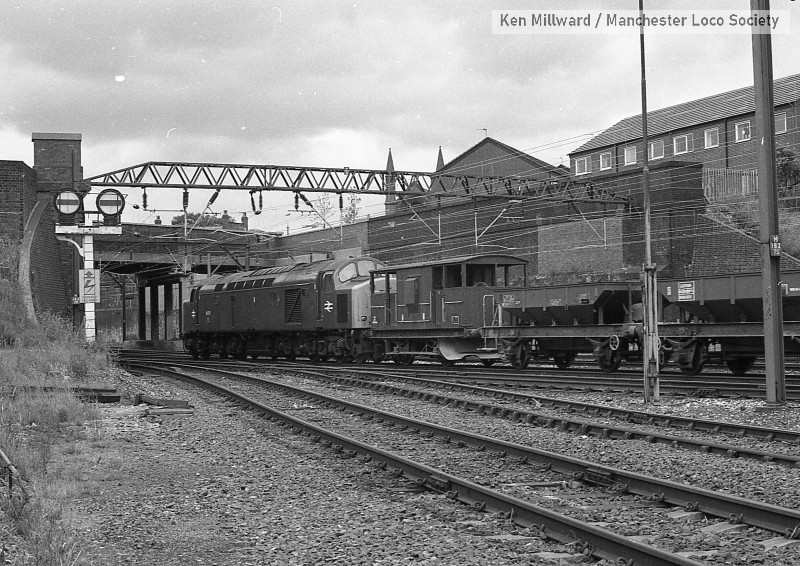 km004-35: 22.07.79 Edgeley Junction No 2. 40 175 with an engineering ballast train passing the signal box. [FP4/8]