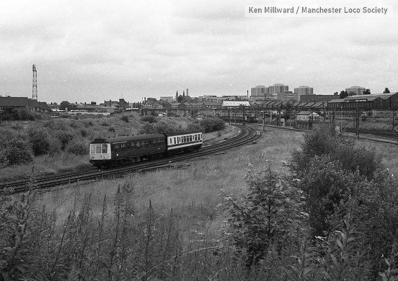 km004-39: 22.07.79 Edgeley Junction No 2. A two coach DMU comes off the Northenden line with an ex Liverpool stopper. [FP4/8]