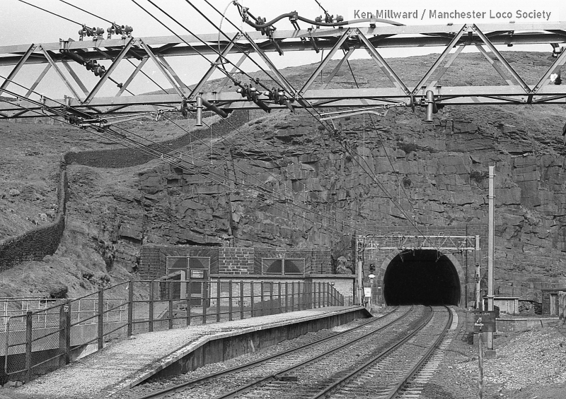 km005-06: ...04.79 Woodhead Station. Up platform and tunnel mouths from the down platform. [FP4/4]