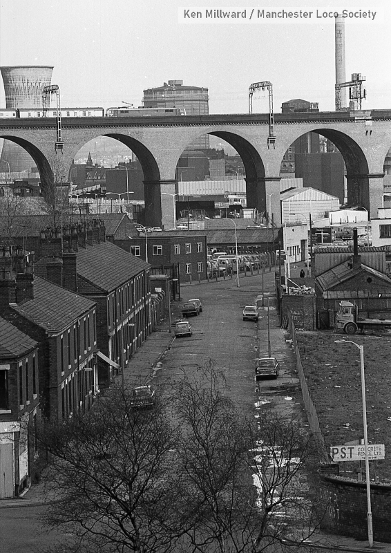 km005-18: 28.04.79 Stockport Viaduct. Class 87 crossing with a London train. Industrial skyline. [FP4/4]