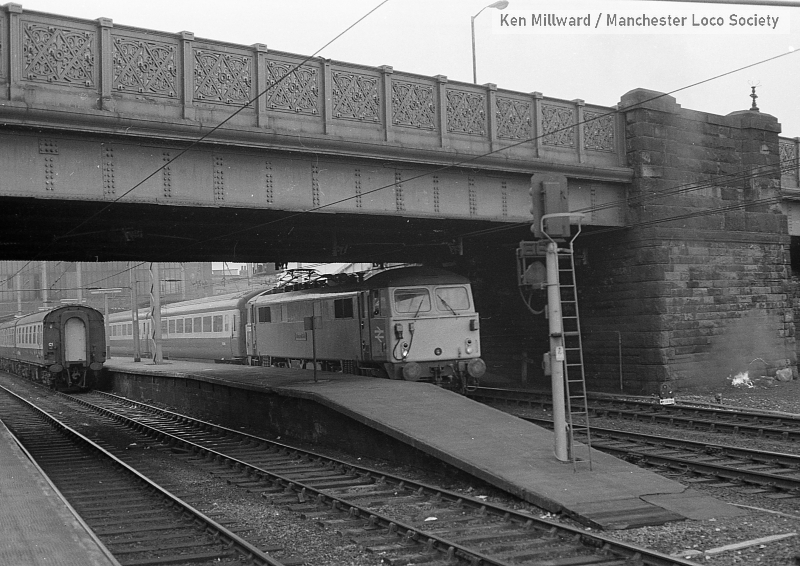 km005-34: 30.05.79 Carlisle. 87 033 'Thane of Fife' stands under the road bridge at the north end of the station. [FP4/6]