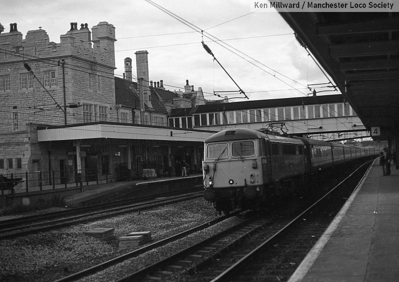 km007-03: 08.08.79 Lancaster Station. 87 010 passing through with Glasgow to Euston express. FP4/11]