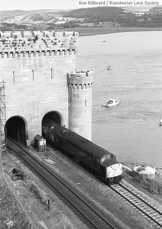 km007-18: 11.08.79 Conwy. 40 091 photographed from the castle leaving Conwy tubular bridge. [FP4/12]