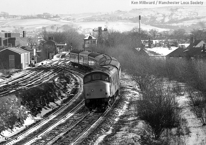 km019-20: 10.10.82 Romiley Junction. 45 104 crossing the junction with the SuO St Pancras to Manchester. [FP4/28]