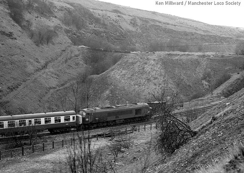 km019-29: 06.03.82 Blackwell Mill. 45 122 is approaching the site of Peak Forest Junction 'Peak Forest Peak' excursion on its return from Buxton [FP4/29]