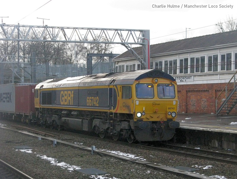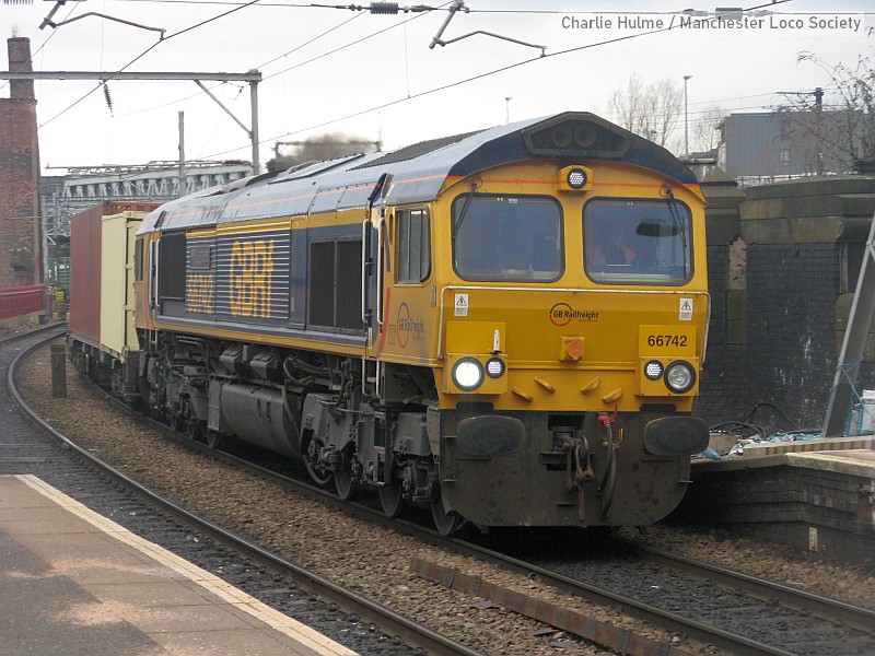 ch197-07: 31.01.15 Stockport. 66 742 'GBRf Peterborough' on diverted intermodal 11:37