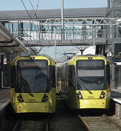 On the trams![]() Metrolink has also seen some operational changes this spring. At Altrincham, the direct service to Bury now serves platform 2, which previously has only seen occasional use, whilst services towards Piccadilly station continue to use Platform 1. A little confusing for passengers, perhaps, but it does give flexibility of operation, as one service can depart the moment the other has arrived. ![]() At Manchester Victoria, the two-sided middle platform has been brought into use as planned, with the Manchester Airport service extended from its temporary terminal at Deansgate-Castlefield to terminate at Victoria. Perhaps surprisingly, trams uses the original cross-city route via Market Street. The 'second city crossing' via Exchange Square remains the preserve of the East Didsbury to Shaw and Rochdale services. The line from Deansgate - Castlefield to St Peters Square now has as many as 35 trams per hour in each direction. |