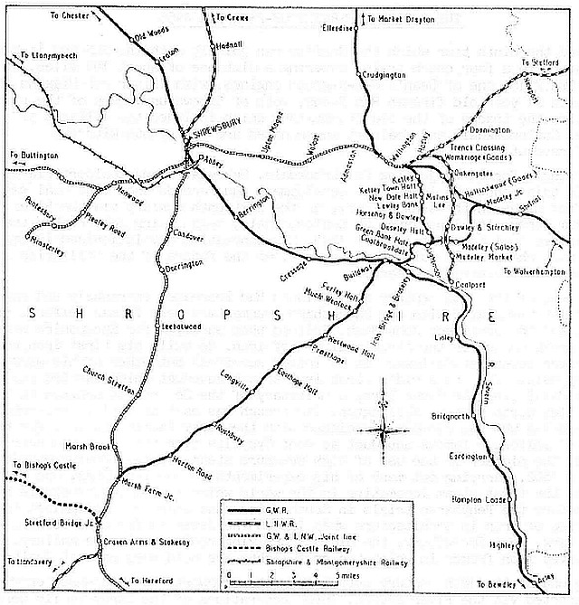 A SHORT REVIEW OF THE SLS/MLS RAILTOURS9. The Shropshire Railtour, 23 April 1955This was the ninth tour which the Society ran jointly with the SLS and it carried 171 passengers in a four coach train, covering a distance of about 100 miles. It was hauled by GWR 2516, one of Dean's O-6-O goods engines, with Driver Bob Higgins at the controls with 21 year old fireman Ron Evans, both of Shrewsbury. Much of the route was to follow the tracks of the old Ironmasters which included the villages of lronbridge, Coalbrookdale and Coalport whose names are synonynous with the industrial revolution.The triangle formed by joining Coalbrookdale, Oakengates and Coalport played a big part in this country's industrial development and records show that coal was exported from mines in the area as early as the sixteenth century via the River Severn. when Abraham Darby, the lronmaster at Coalbrookdale, began using coke rather than charcoal as his fuel to smelt iron in 1709, his innovation revolutionised ironmaking as it was much cheaper and quicker to produce, so the future of the collieries and the ironworks was secured for years. By the end of the 18th century the business had increased enormously and among the famous men associated with the Shropshire ironmasters were Thomas Telford, Richard Trevithick and the architect John Nash. Telford when surveyor for Shropshire became the first great master in the structural use of iron. He built his first iron bridge over the River Severn at Buildwas (it no longer survives) but other of his works do. He was responsible for the world's first iron trough aqueduct which carried the Shrewsbury Canal over the River Tern, a tributary of the Severn, at Longton on Tern about 3½ miles north west of Wellington. Its trough was cast at Ketley Ironworks by William Reynolds who was closely associated with the Darby family and this was the prototype of Telford's famous aqueduct at Pont Cysyllte over the River Dee near Ruabon. Trevithick, the pioneer in the use of high pressure steam, visited Coalbrookdale in 1796 and in 1802, carrying out many of his experiments in the ironworks. One of the results was the first steam locomotive in the world which ran on Coalbrookdale rails in 1802, before the Penydaren trials in South wales. And John Nash recognised the possibilities of iron in architecture when in 1805 he designed for Lord Berwick at Attingham Park, near Shrewsbury, the oldest surviving roof-lit picture gallery. The slender carved iron frames in which the roof lights are held were cast at Coalbrookdale. By the end of the 18th century output from the ironworks had increased enormously and was exported via the River Severn. Three generations of the Darby family were involved and in 1754 they built new smelting furnaces at Horsehay which were connected with Coalbrookdale and the river by waggonways, the plates of which were manufactured at Coalbrookdale foundry. In addition, a long 1050 ft. inclined plane was built to lift and lower canal boats to and from the river. The third Abraham Darby is perhaps best remembered for his bridge construction and in particular for the world's first cast iron bridge which was completed across the Severn Gorge. it does not contain a single bolt, nut or rivet. It was cast at Coalbrookdale, is 196 ft long with one major span of 100 ft. It is still in use for pedestrians but closed for vehicles in the 1930s. It is now a substantial reminder of the achievements of those very early days in the area. Railways reached the Coalbrookdale area in the 1850s, starting with the to Wellington line which eventually became GWR and LNWR Joint and Shrewsbury opened on 1.6.1849. It was extended by the GWR to Wolverhampton in November of the same year. The tour started from Platform 6 at Shrewsbury at 2.25pm with 2516 carrying the usual load of passengers; there were hardened members who never missed a railtour anywhere and others of more selective nature such as those who timed and noted every passing feature on labouriously drawn up schedules tediously prepared with columns of red and green inks. Among the bric a brac on the various tables might be the principal weapons of those about to indulge their fancies to the full; for some the one-inch map, for others the RCH diagrams and a smaller contingent content to log every engine number and consider the day well spent. Others eagerly scanned through the windows for any evidence of old tramways or canals or to see who might spot the cameras of Arthur Camwell or Patrick Whitehouse as a small number of road vehicles followed us about. ![]() Leaving Shrewsbury round the curve towards Wellington we soon got going at a spanking pace. There was a brief stop at Wellington to pick up more enthusiasts including two people who were fighting to get the closed Coalport line re-opened. Leaving here we continued on the main line for just over a mile before branching on the single track Much Wenlock line at Ketley Junction. The ruling gradient was 1 in 50 and in just under another half mile passed Ketley station (1m 47ch from Wellington) with substantial buildings on the down side and a siding which gave access to a factory. It was also the site of a one-time ironworks. ln another half mile we passed Ketley Town Halt (opened 6.3.1936) which consisted of a short wooden platform with a timber shelter on the left of the line. The next station, again half a mile distant, was New Dale Halt (opened 29.1.1934) which was identical in construction. The line still climbed round sharp curves at 1 in45 to the level crossing at Lawley Bank which had a combined signal cabin and timber shelter and was at the top of the bank. From leaving the junction our progress up the hill got slower and slower and we began to think it would be the worst place for the brakes to leak on. The loco was certainly winded but made it to the top of the bank, then stopped. Heads hung out of windows and we learned that the fire was in poor shape, the driver calling to Hea