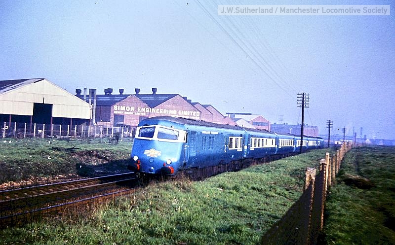 ws105-28: ........ Cheadle Heath spring 1965. Midland Pullman passes Simon Engineering works